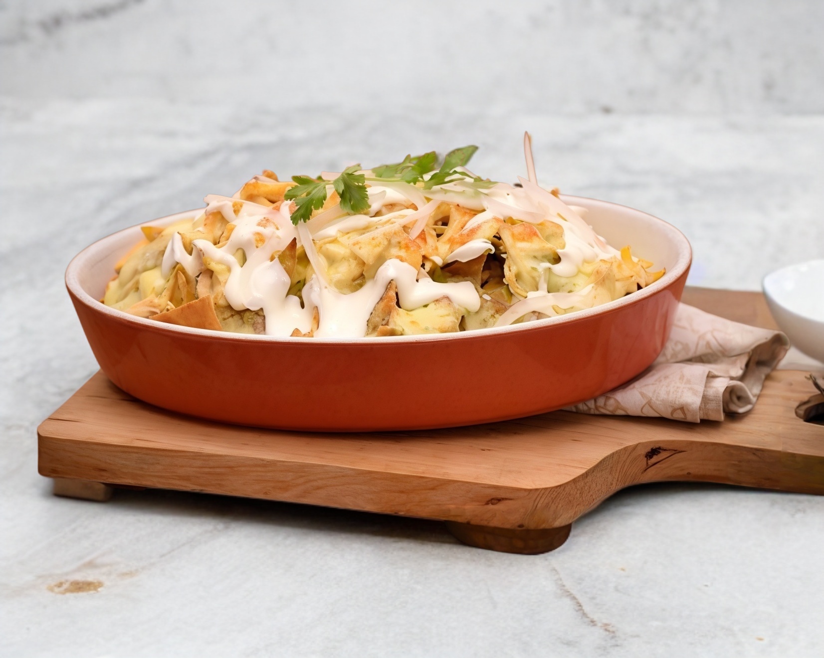 Porción personal de Deliciosos chilaquiles con pechuga de pollo asada rellena de jamón y queso, cubiertos de lechuga Italiana, crema baja en grasa, queso rallado, frijoles y 1 pan bolillo, aparte lleva salsa, roja, verde o suiza según tu elección.