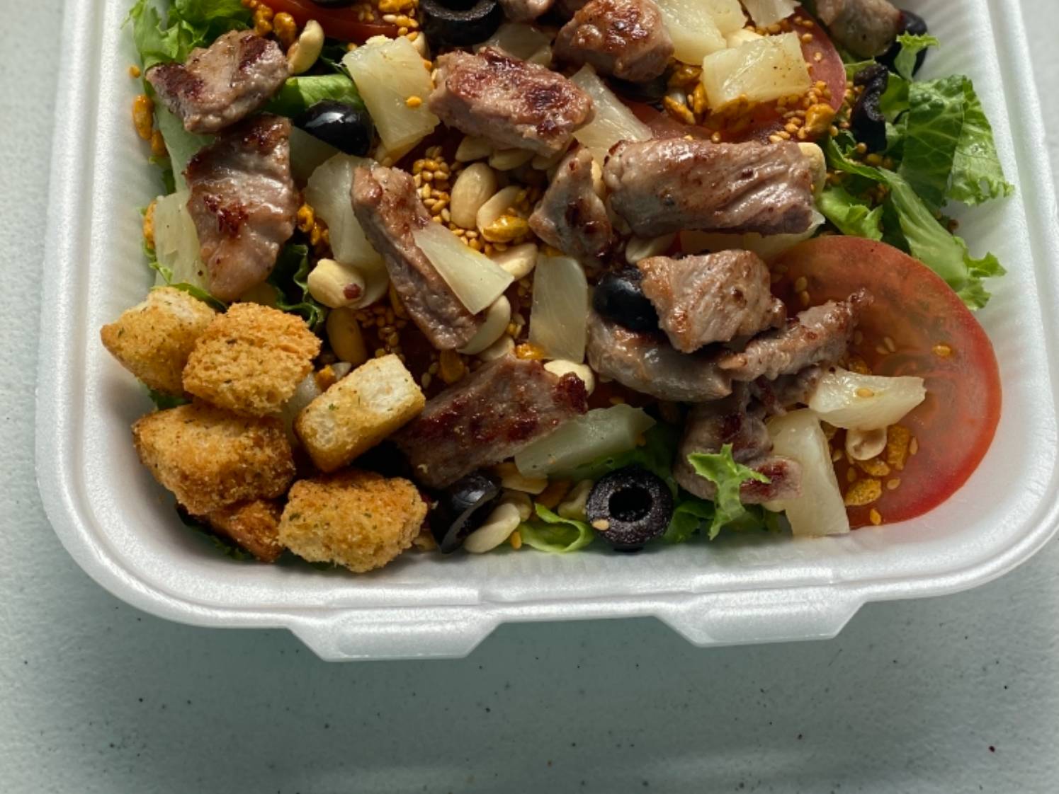 Lechuga italiana cortada, rodajas de jitomate, bistec de res a la plancha, crotones.