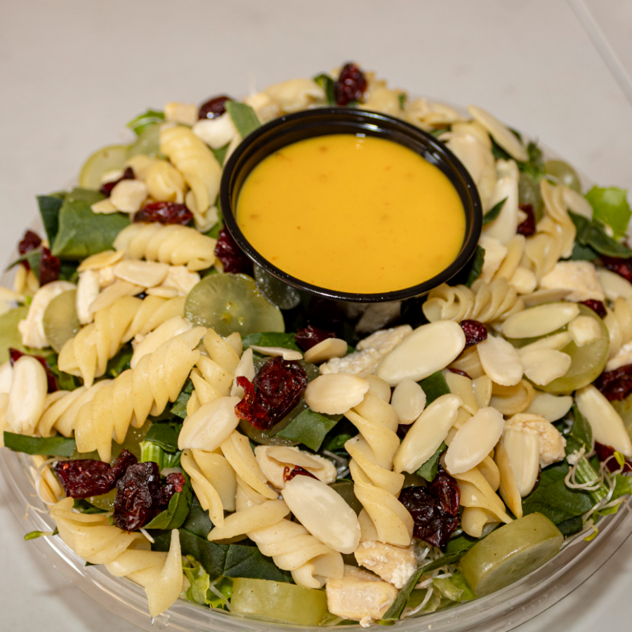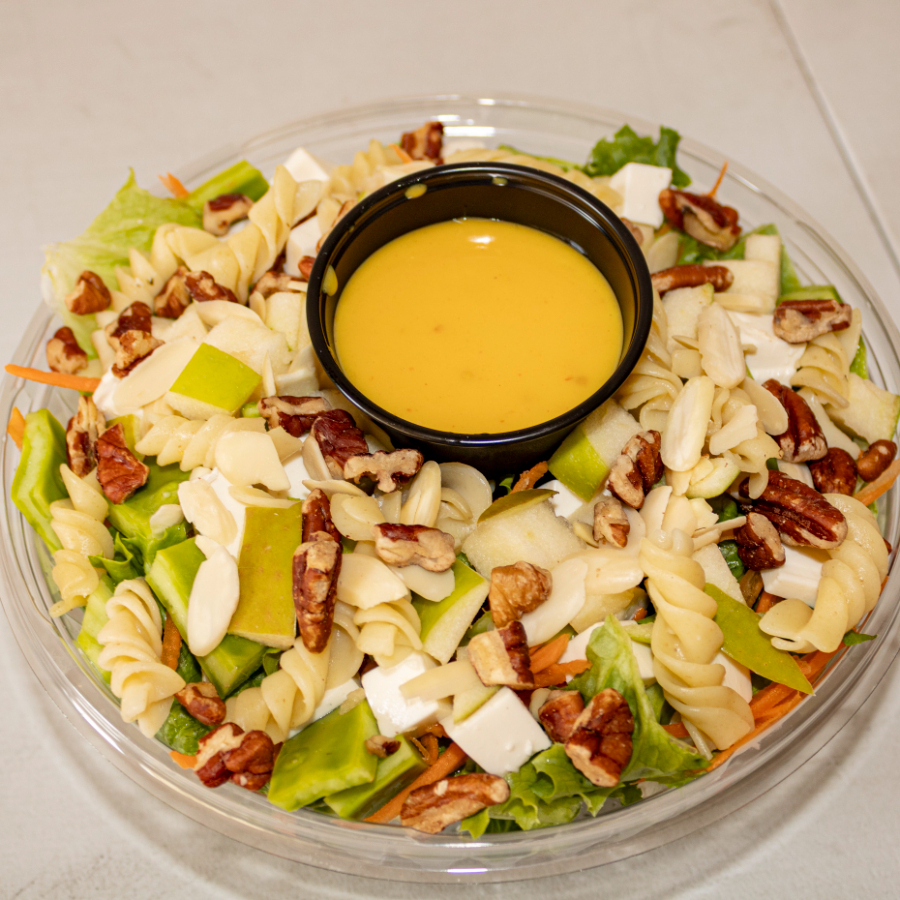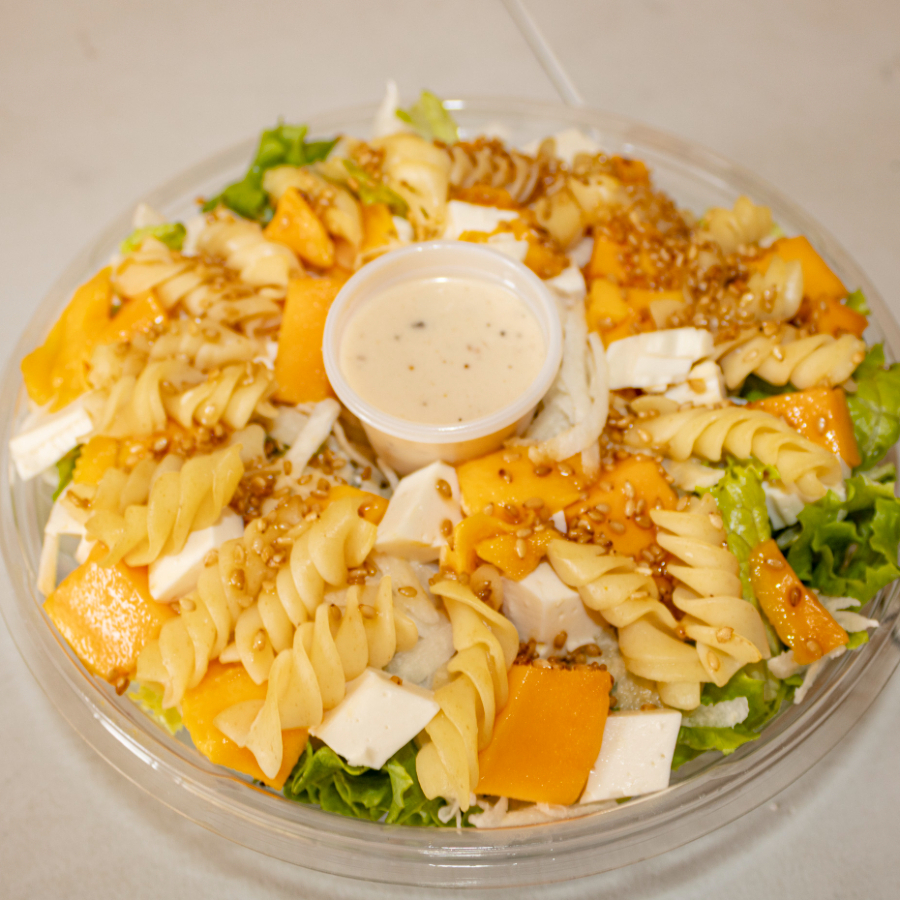 Base de lechuga, 2 proteinas, 2 vegetales, 2 frutas, pasta, 2 semillas, 1 aderezo