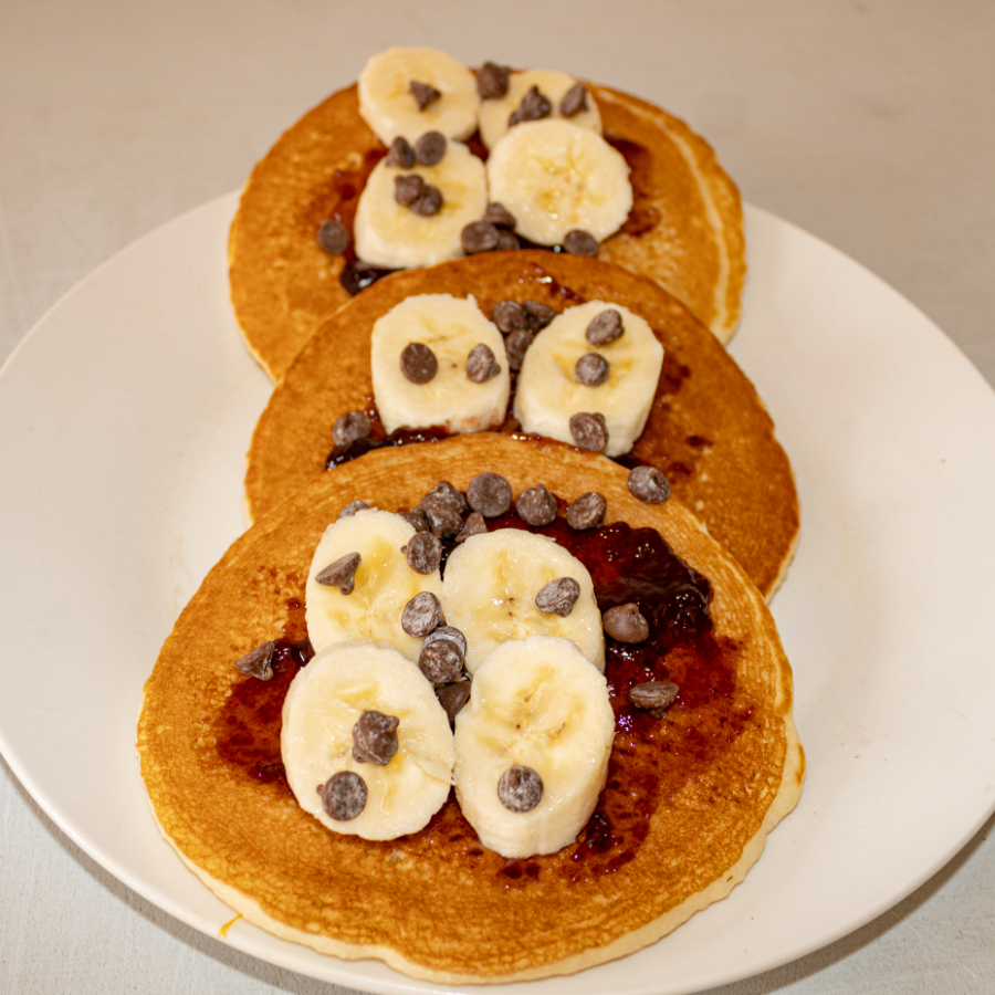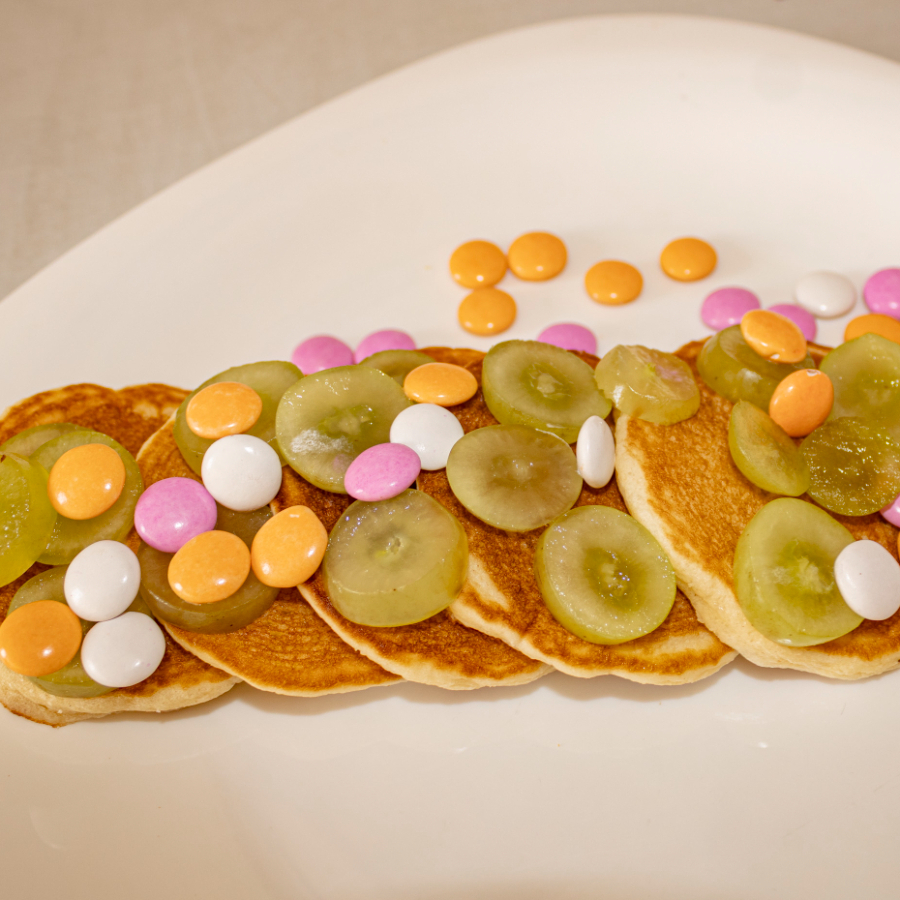 5 Piezas de mini hot cakes, con una fruta, base líquida y un topping