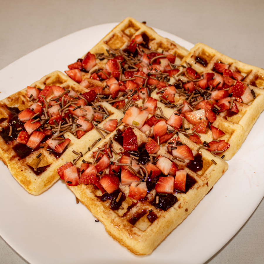 Cuatro Waffles Dulces acompañados de una base, una fruta y un topping