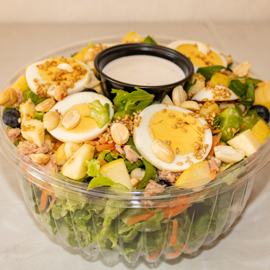 Ensalada con base de lechuga o espinaca, donde puedes agregar 3 proteínas,1 carbohidrato, 3 frutas, 3 vegetales, 3 semillas y aderezo