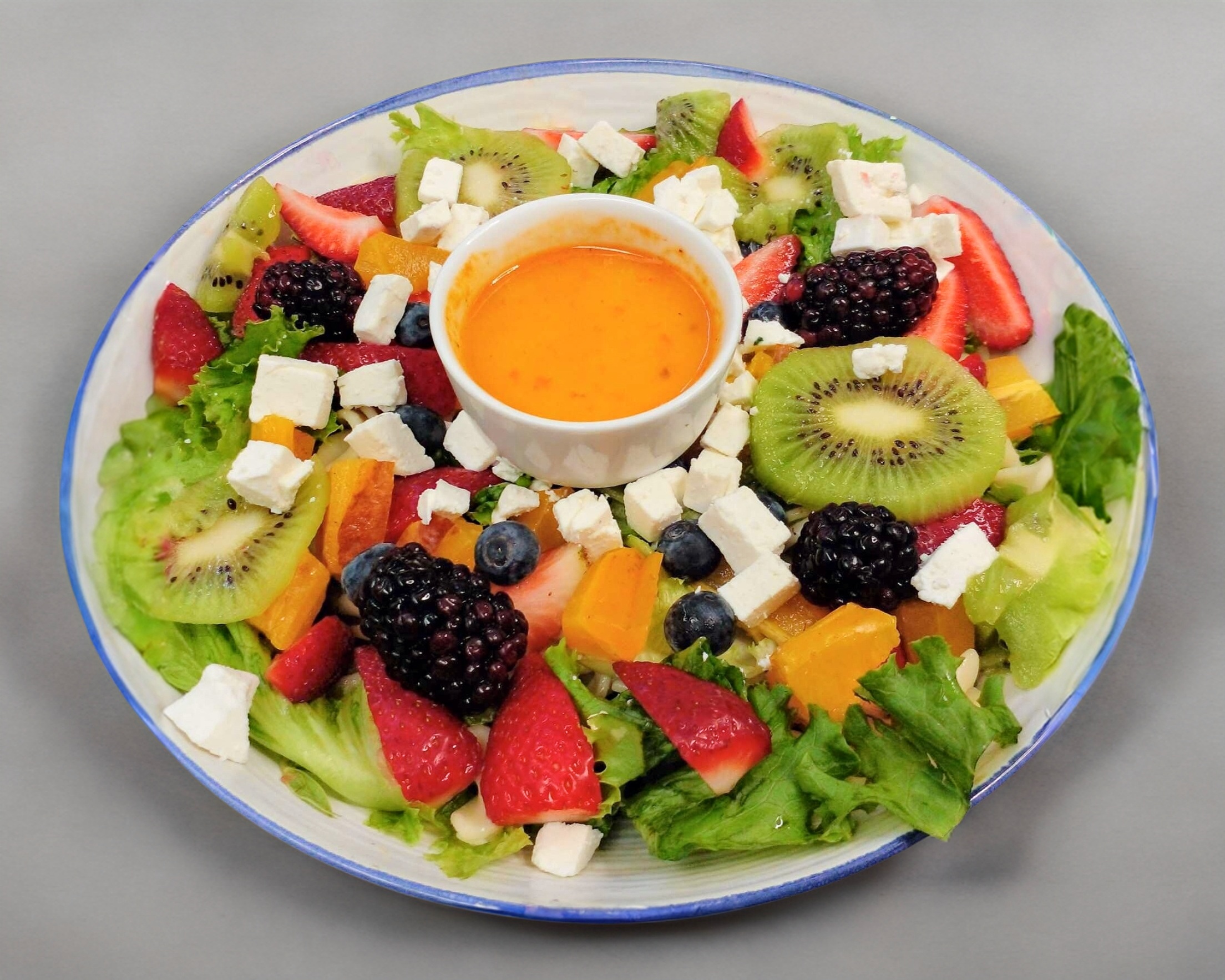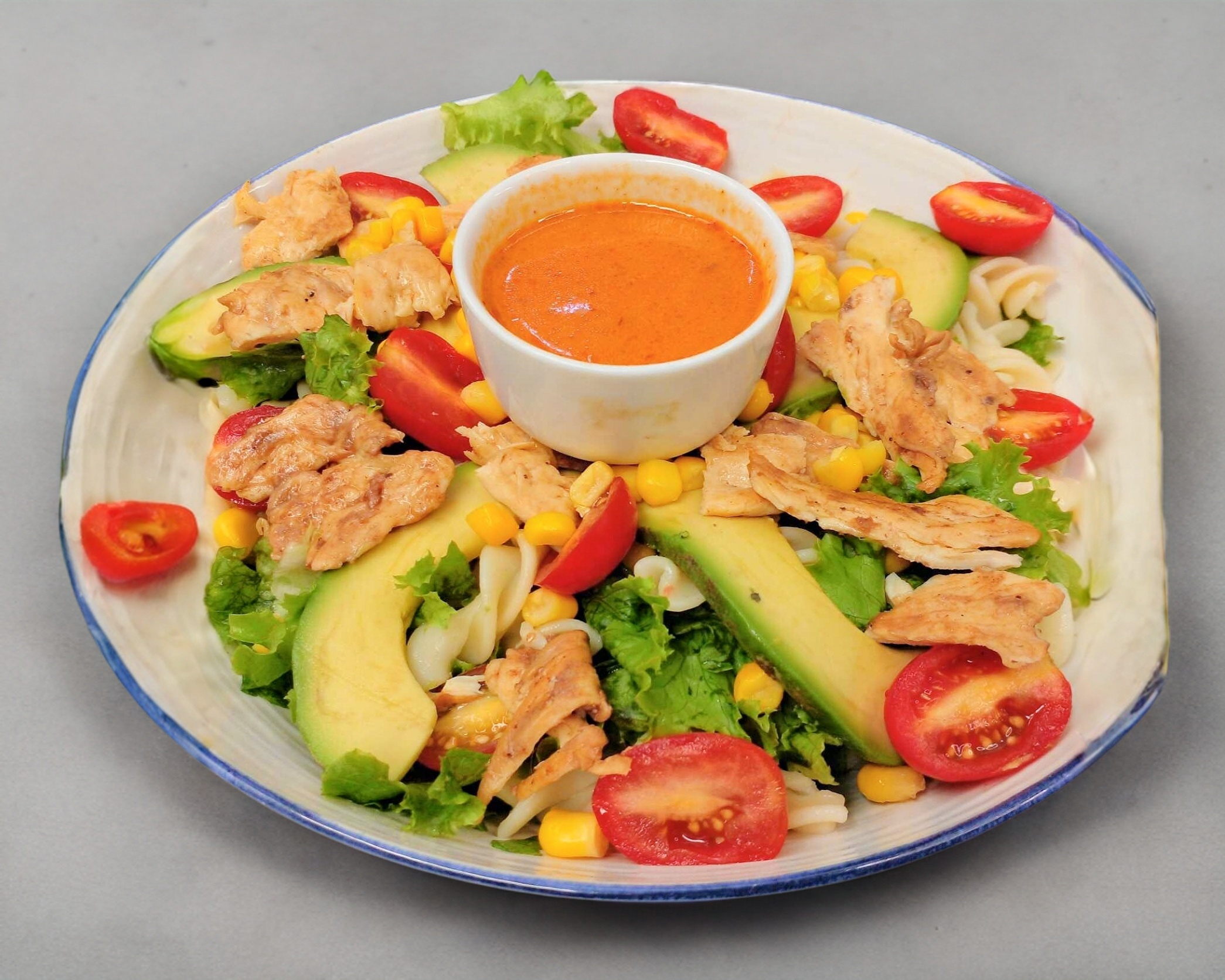 Base de lechugas mixtas, cherry, Pechuga a la plancha, aguacate, elotito, pasta y el aderezo de su elección.