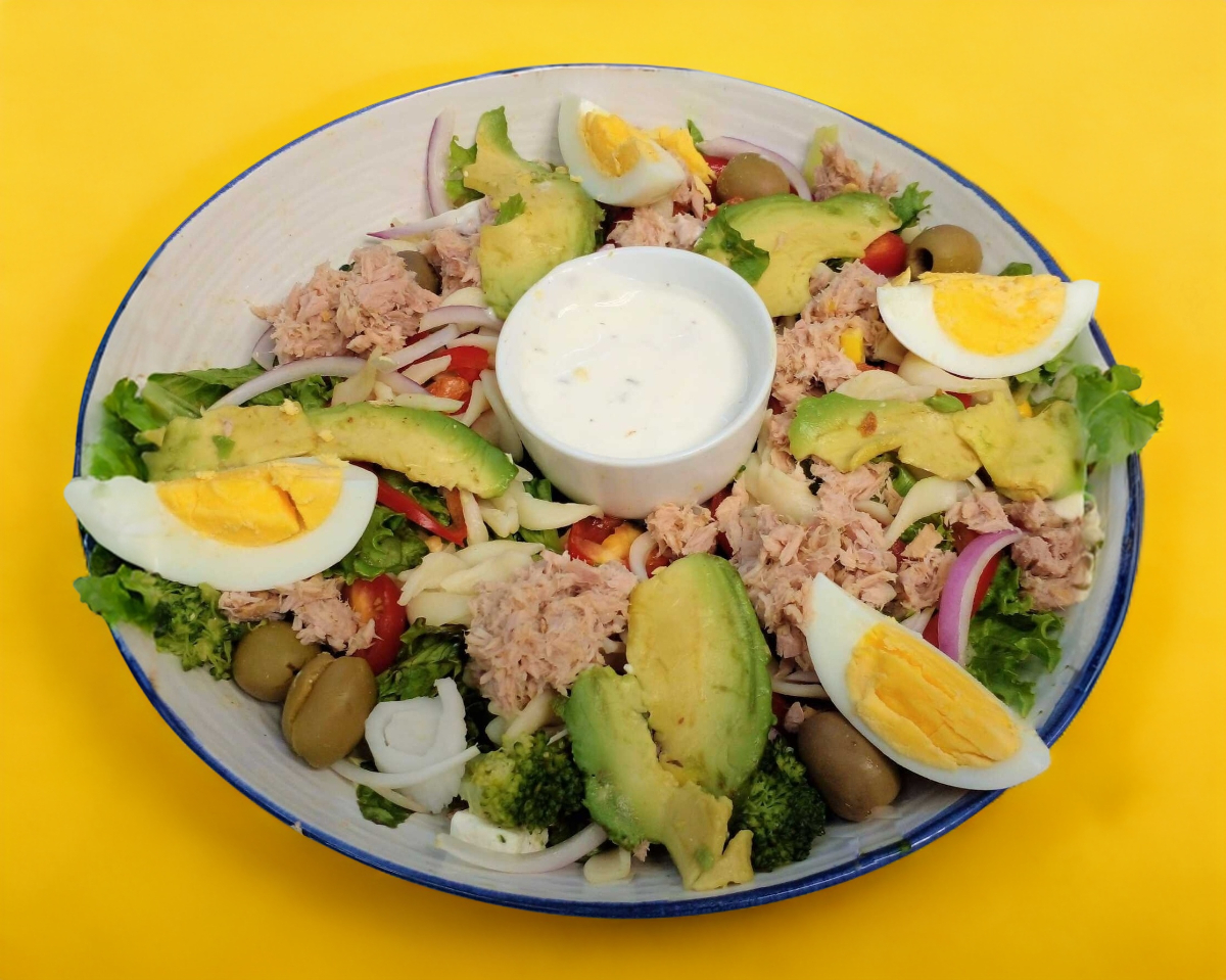 Base de lechugas mixtas, atún, huevo duro, jitomate, aguacate, cebolla morada, pasta, con un toque de perejil, limón, sal y pimienta. Crocante y aderezo de su preferencia.