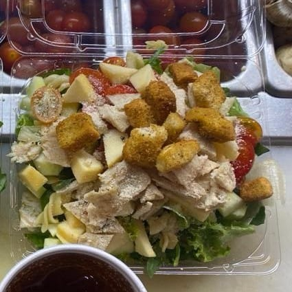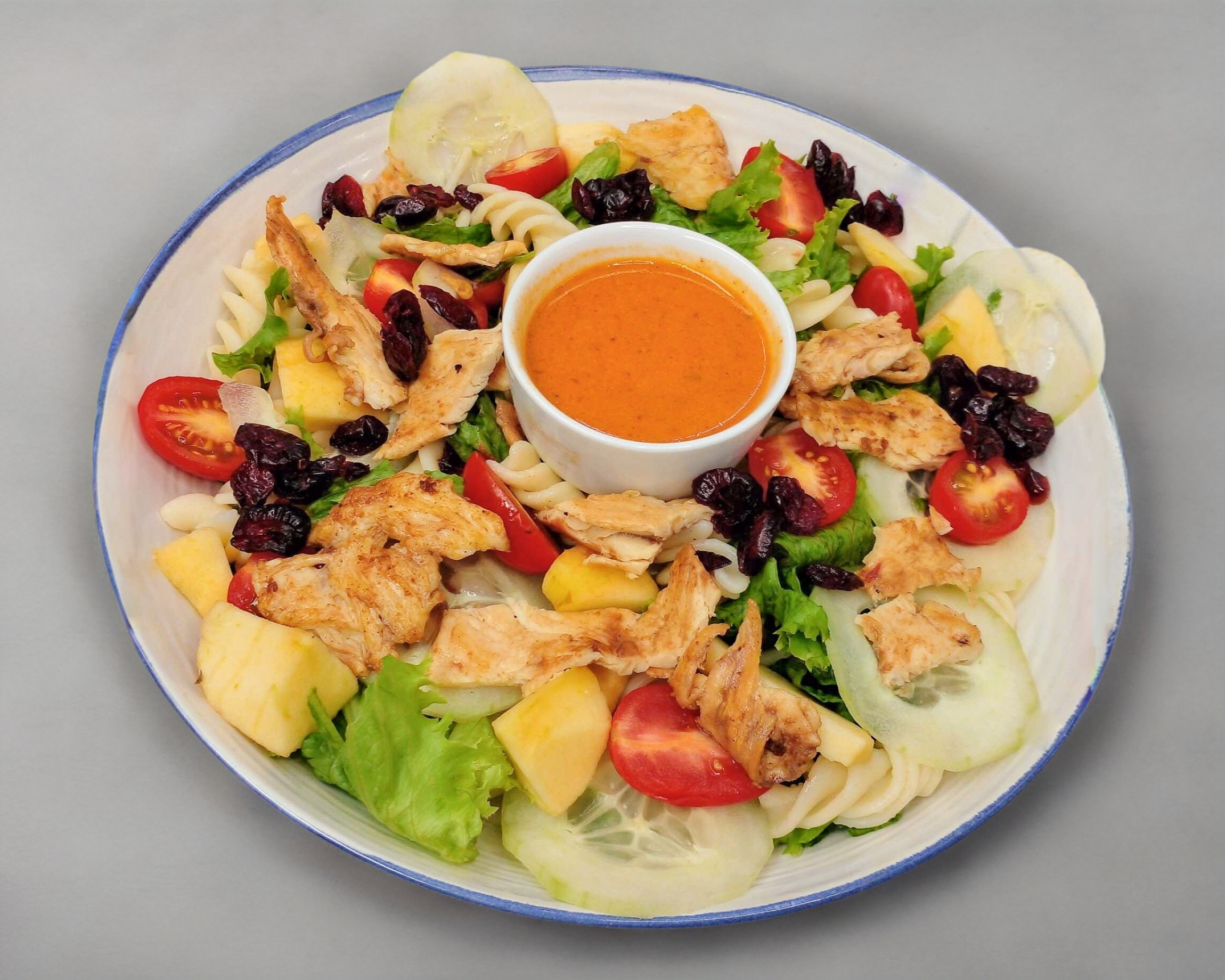 Base de lecchuga y espinaca, pasta, pepino, cherry, manzana, pechuga de pollo a la plancha y queso parmesano, crocante y aderezo a elegir.