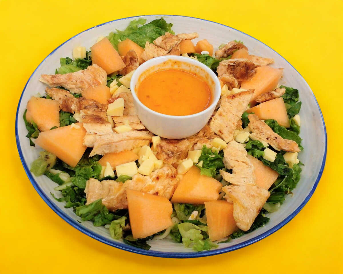 Base de espinacas, bocados de melón, queso manchego, pollo a la plancha y queso parmesano.