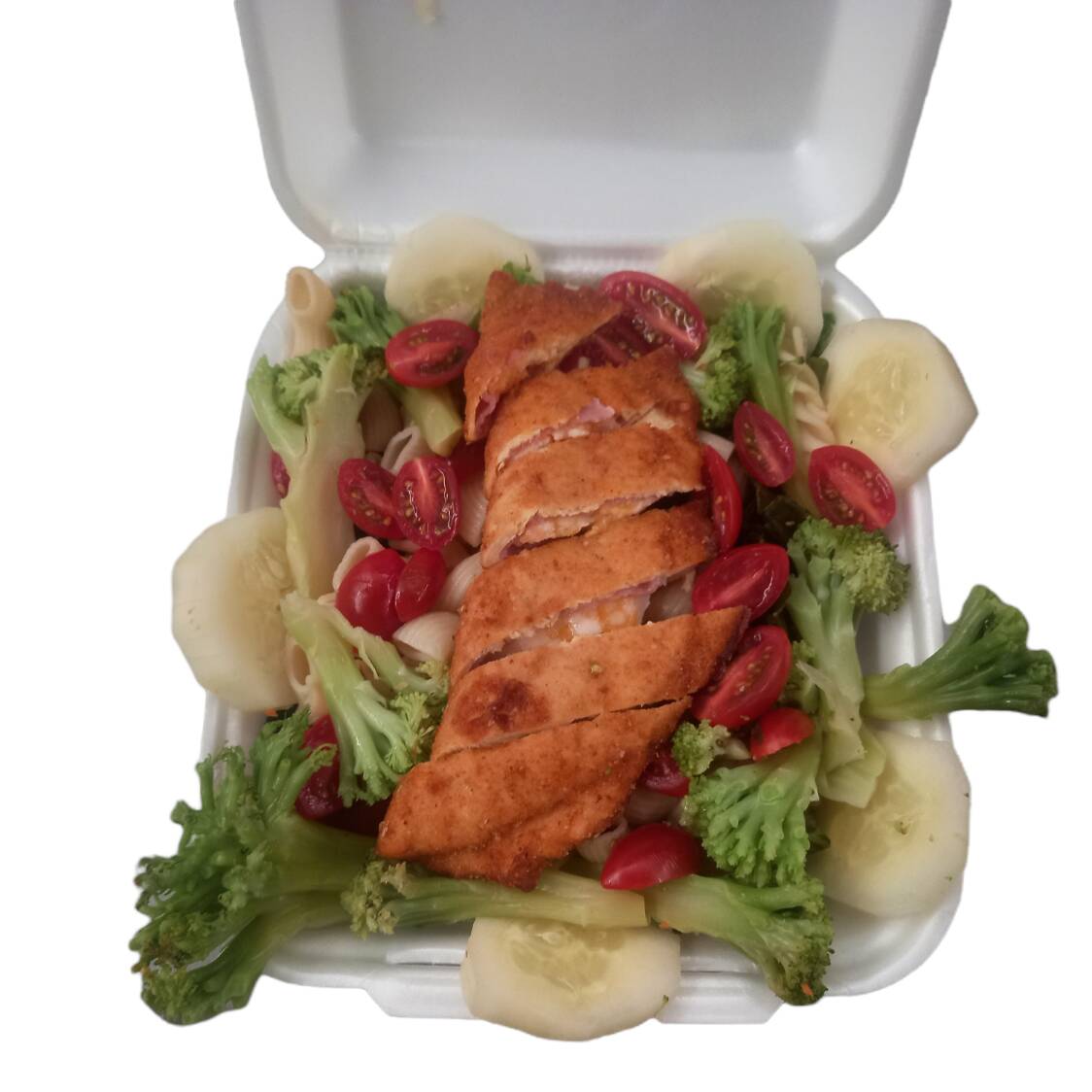 Base de lechuga jitomate cherry ,brocoli, pepino, pechuga corden bleu