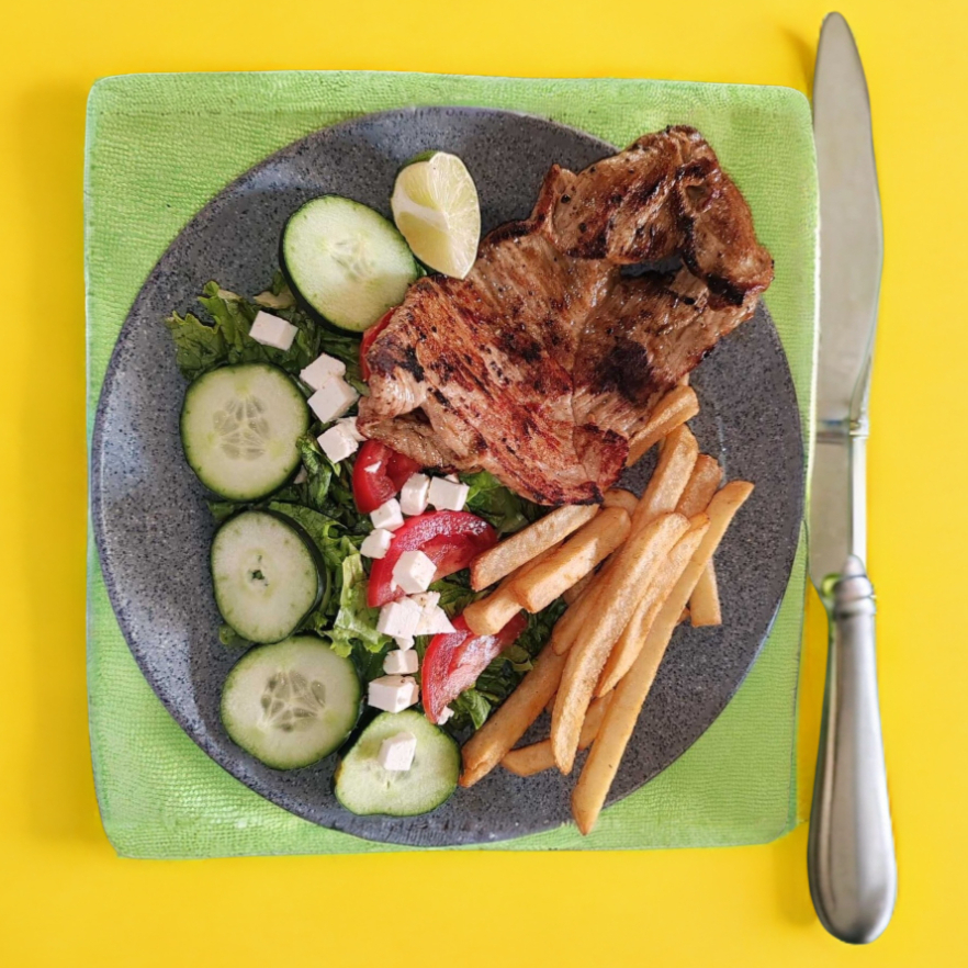 filete de arrachera, con porción de papas a la francesa y ensalada
