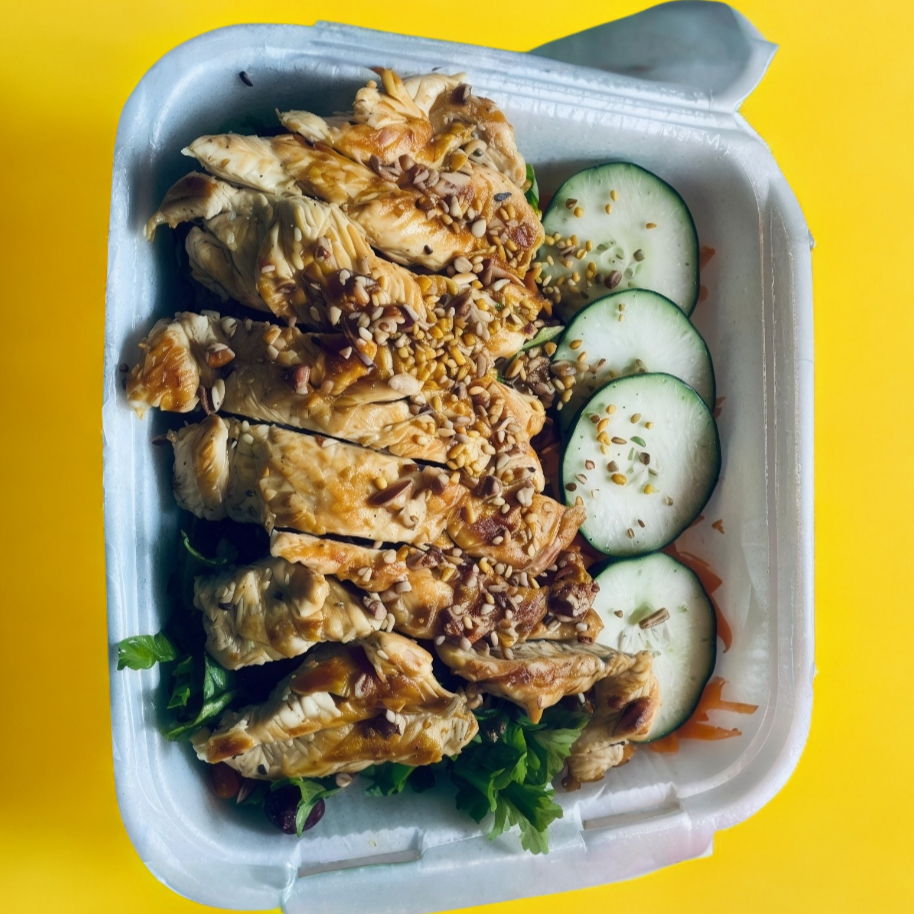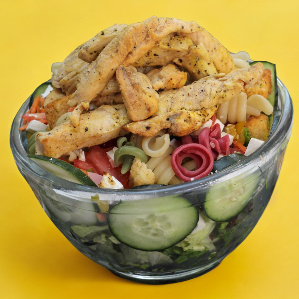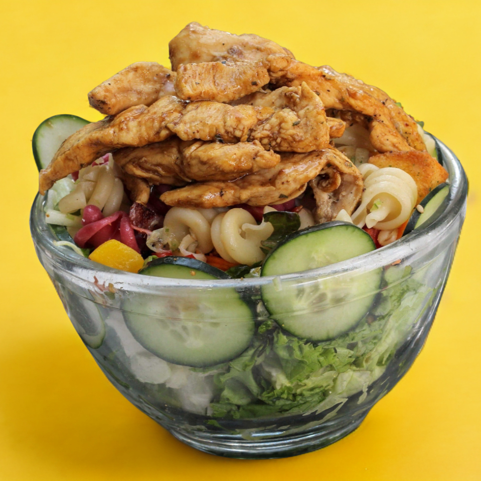 Pollo teriyaki, base (mix de lechugas (romana, italiana), pepino, zanahoria, jitomate, pimiento, arándano, crotones, pasta y queso panela.