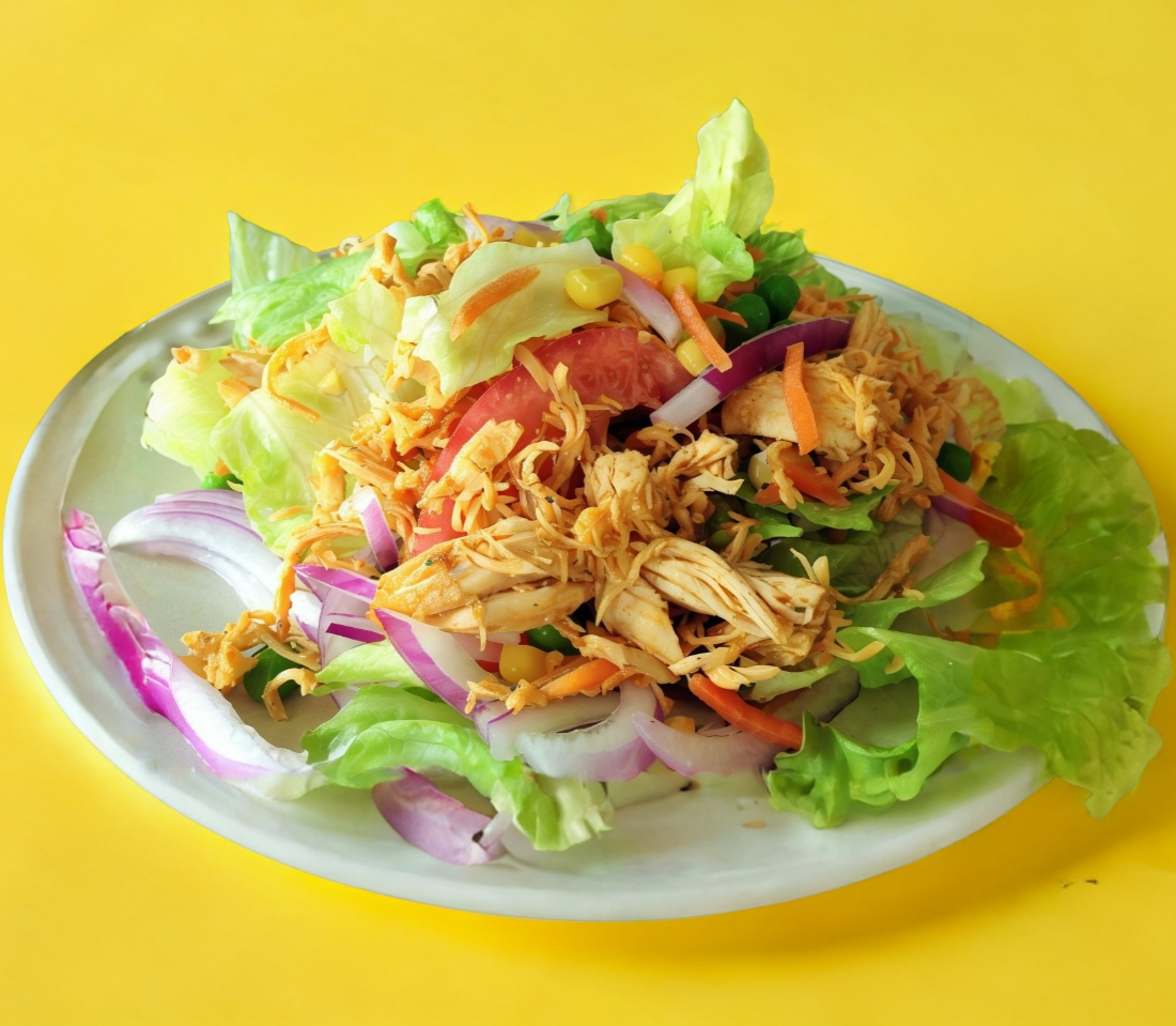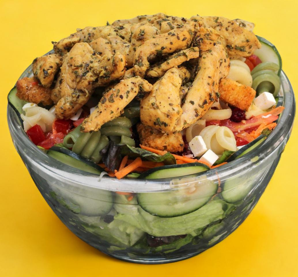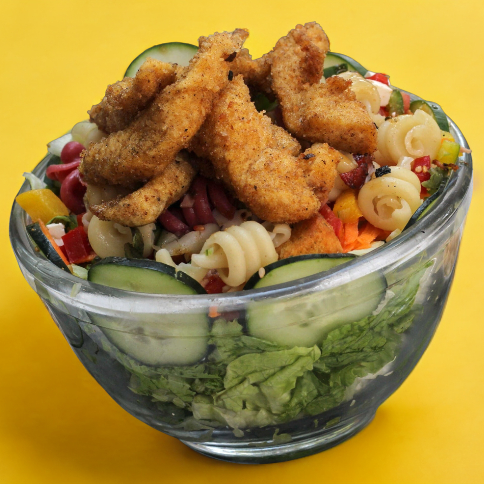 Pollo empanizado, base (mix de lechugas (romana, italiana), pepino, zanahoria, jitomate, pimiento, arándano, crotones, pasta y queso panela.