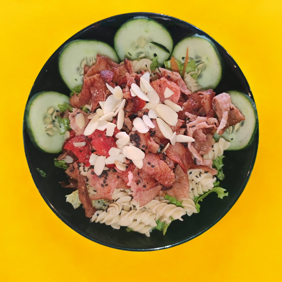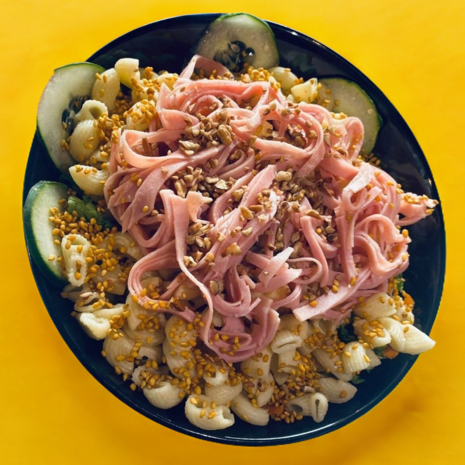 Carnes frías (salami, pepperoni, tocino, jamón) + base (mix de lechugas (romana,italiana), pepino, zanahoria, jitomate, pimiento, arándano, crotones, pasta y queso panela.