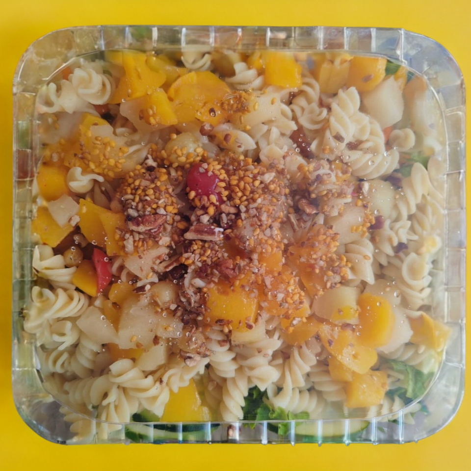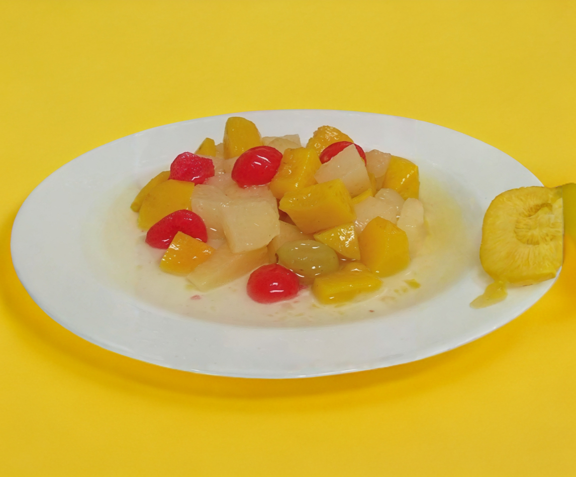 Fruta en almíbar, + base (mix de lechugas (romana, italiana), pepino, zanahoria, jitomate, pimiento, arándano, crotones, pasta y queso panela.