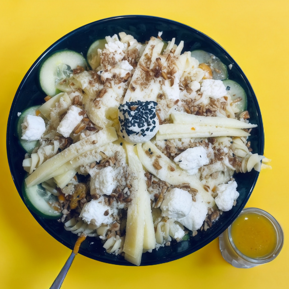 Quesos (panela, manchego, doble crema y parmesano) + base (mix de lechugas (romana, italiana), pepino, zanahoria, jitomate, pimiento, arándano, crotones, pasta y queso panela.