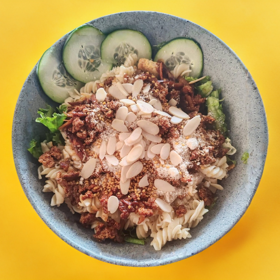 Boloñesa, queso parmesano + base (mix de lechugas (romana, italiana), pepino, zanahoria, jitomate, pimiento, arándano, crotones, pasta y queso panela.,