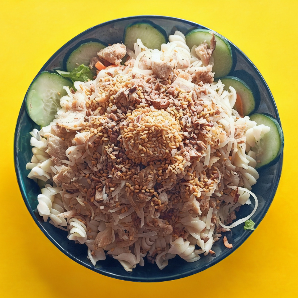 Pollo asado con coco y PIÑA en su jugo, bolita de queso crema con ajonjolí garapiñado + base (mix de lechugas (romana, italiana), pepino, zanahoria, jitomate, pimiento, arándano, crotones, pasta y queso panela.