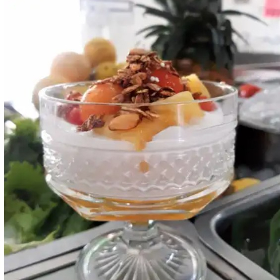 Papaya, melón, sandía, piña, chantillí y granola.