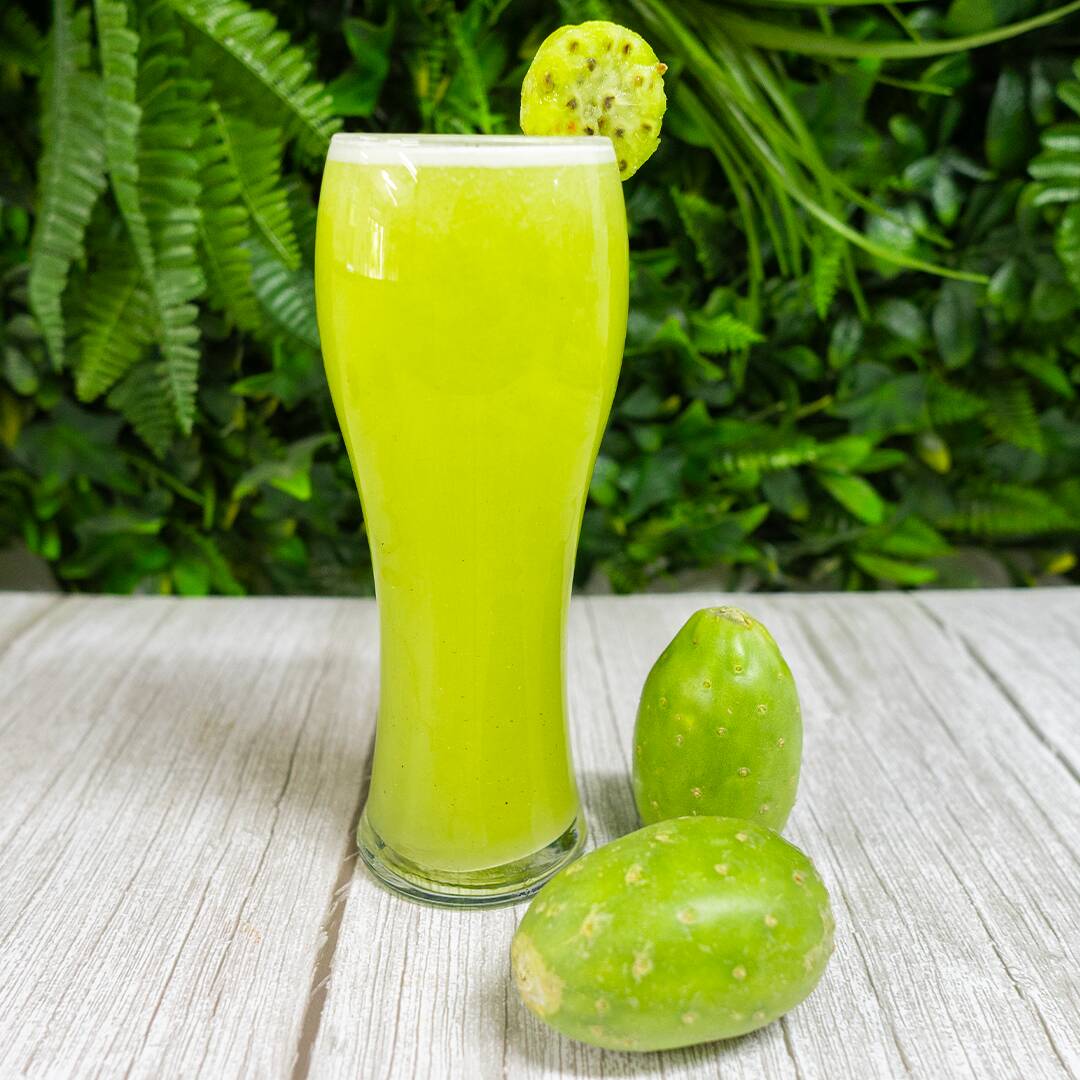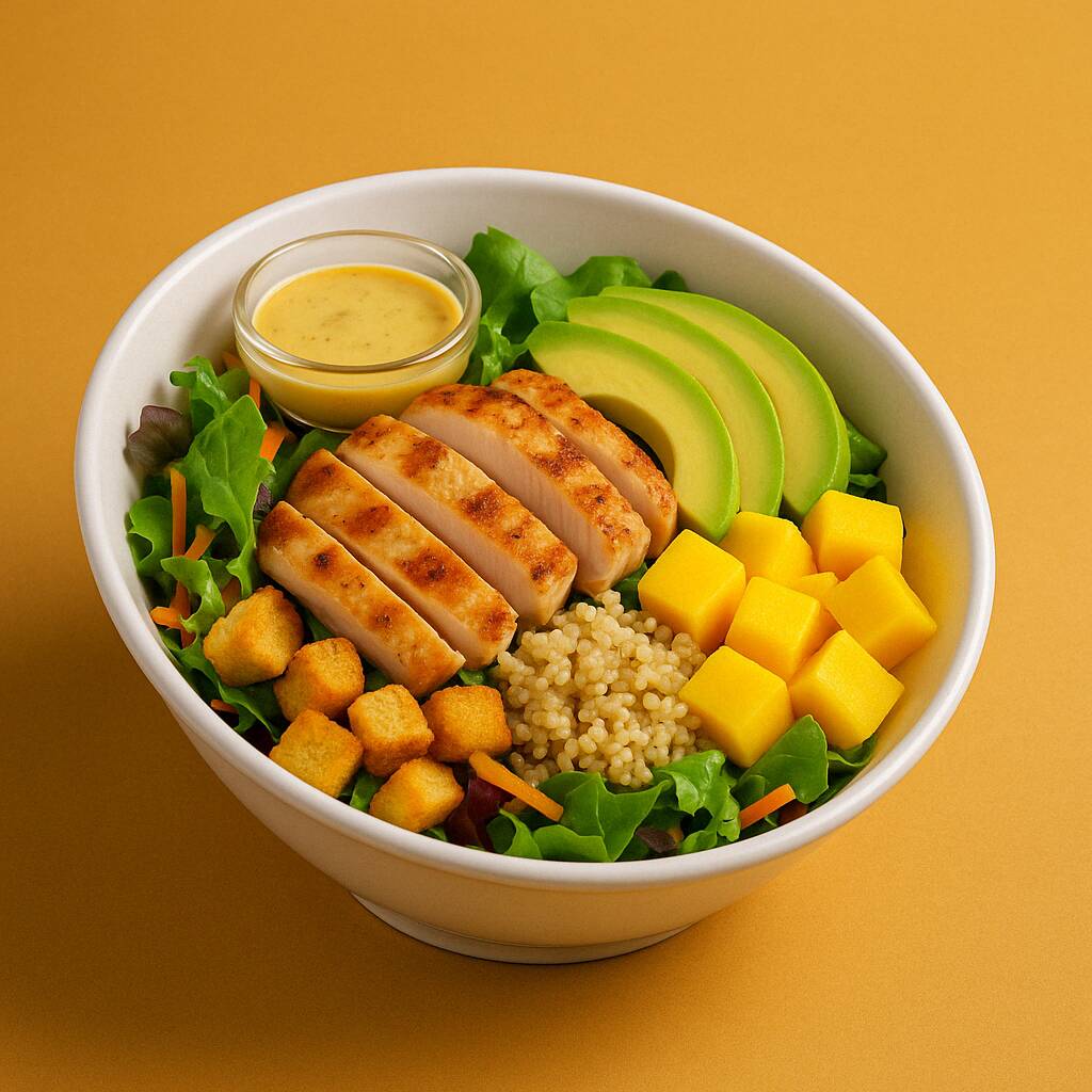 Base de lechuga con zanahoria rayada, pechuga de pollo asada, aguacate, mango o fresa (temporada), crotones y aderezo.