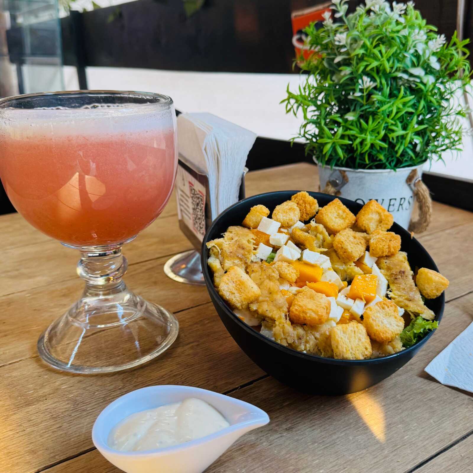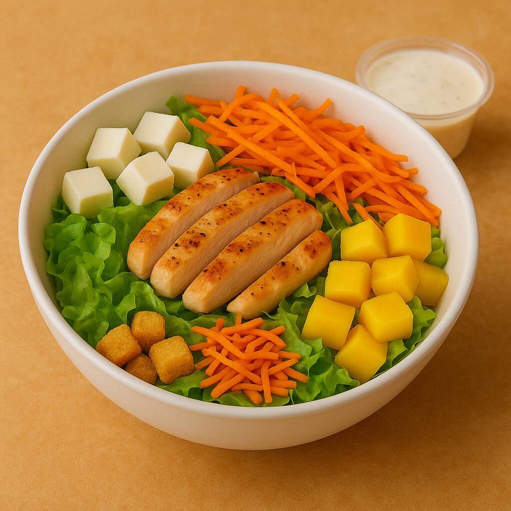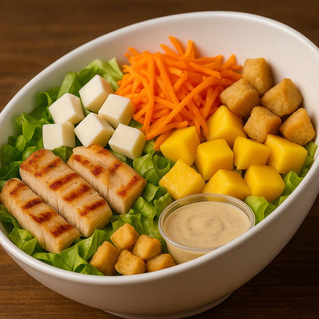Base de lechuga italiana con zanahoria rayada, pechuga de pollo asada, queso panela en cubos, mango o freso (temporada), crotones y aderezo