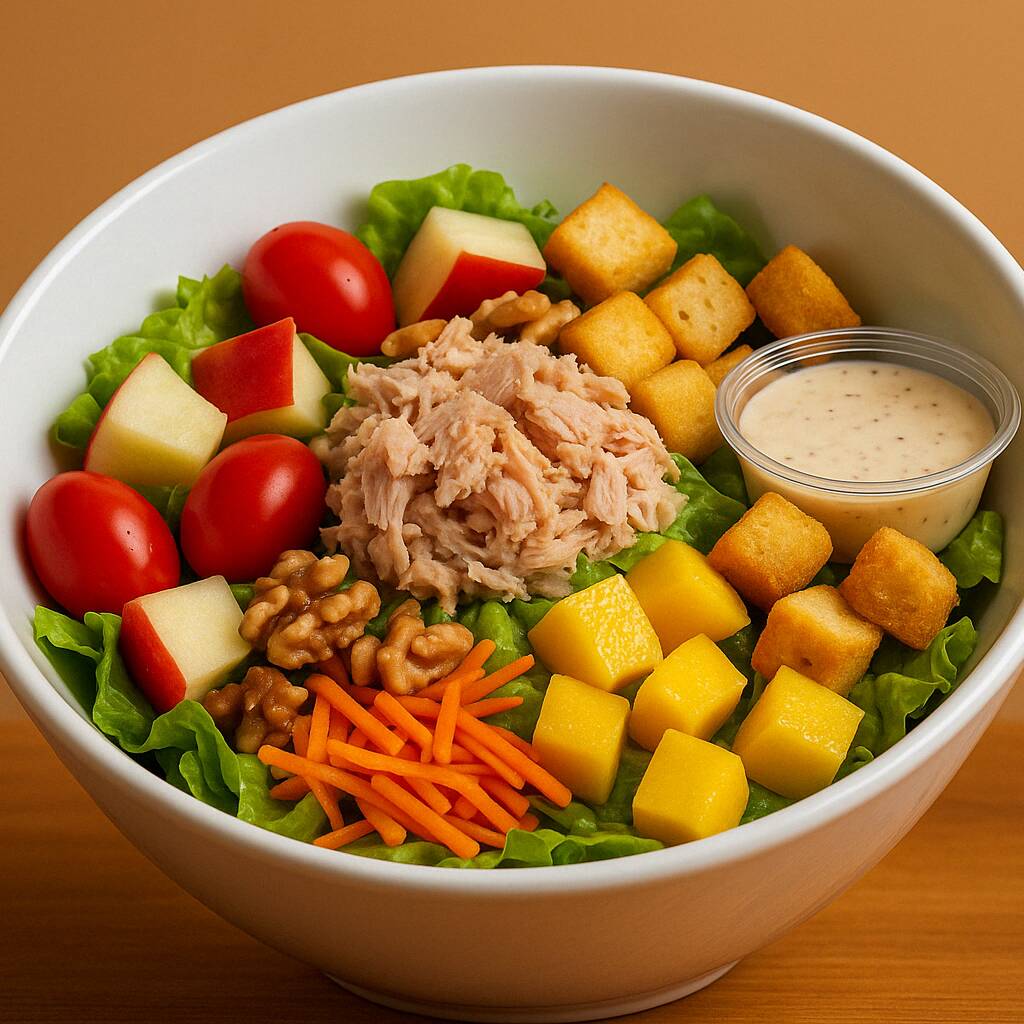 Base de lechuga con zanahoria rayada, atun, nuez troceada, manzana en cubos, crotones y aderezo.