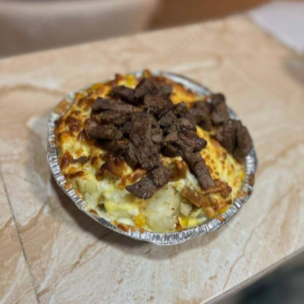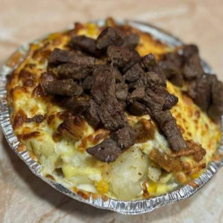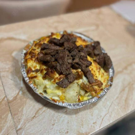 Papa al horno rellena de bistec con queso gratinado y un toque de sal y pimienta.