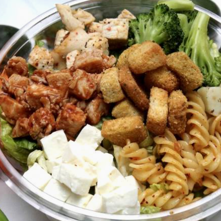 Base de pasta, 75 g proteína (elige entre 1 ó 2), 2 toppings y 1 salsa.