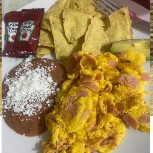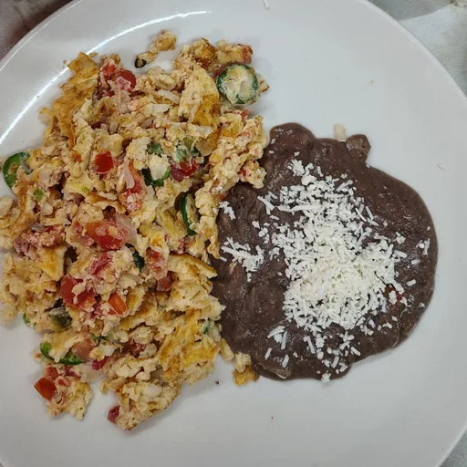 Clásicos huevos revueltos con jamón, preparados al momento y al estilo casero. Servidos con frijoles refritos con queso espolvoreado, verduras al vapor y un toque de cátsup o rebanadas de aguacate (según disponibilidad). Incluye tortillas, totopos o pan. ¡Un desayuno tradicional, sabroso y completo!.
