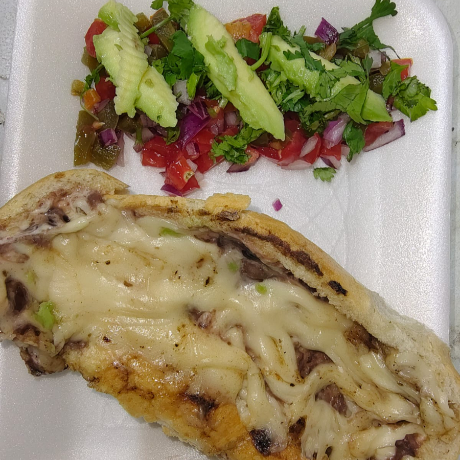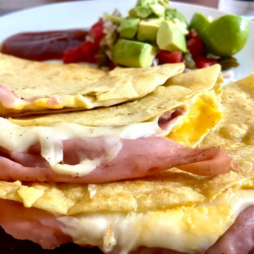 Tortilla de harina con jamón queso amarillo y queso Oaxaca. Acompañadas de pico de gallo, cátsup y aguacate.
