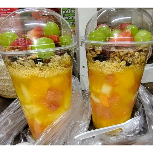 9 Frutas (manzana, sandía, fresa, melón, papaya, uva, piña y plátano), 11 cereales (granola, pasas, cacahuate, amaranto, avena, linaza, chía, arándano, nuez, almendra, semilla de girasol), miel y jugo de naranja 500 ml.