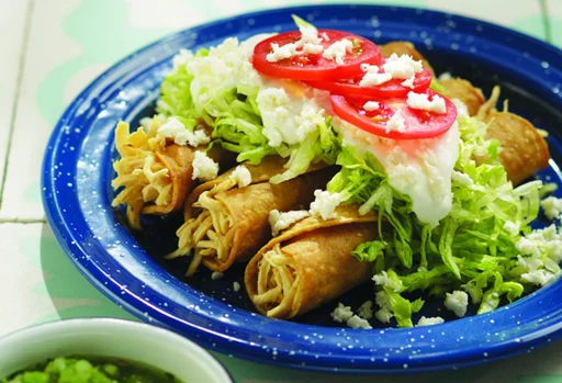 3 Tacos en tortilla de maíz con crema, queso y lechuga.