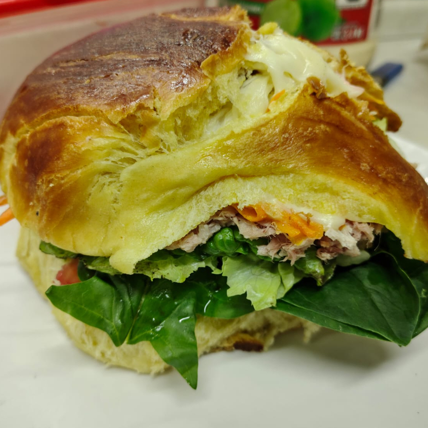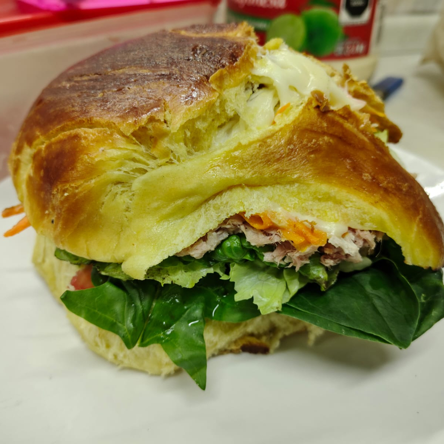 Cuernito con atún, jitomate, aguacate, pepino, zanahoria, quesillo, cebolla, espinaca y lechuga.