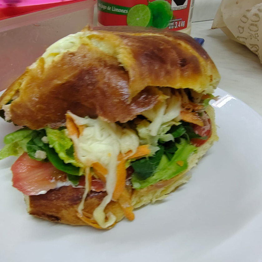 Cuernito con jamón, piña, jitomate, aguacate, pepino, zanahoria, quesillo, cebolla, espinaca y lechuga.