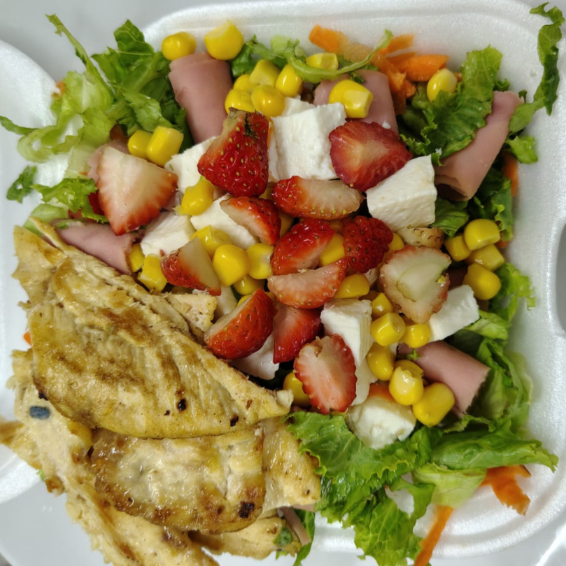 Mix de lechuga rollitos de jamon, cubitos de queso panela, granitos de elotes, fresitas y pechuga asada