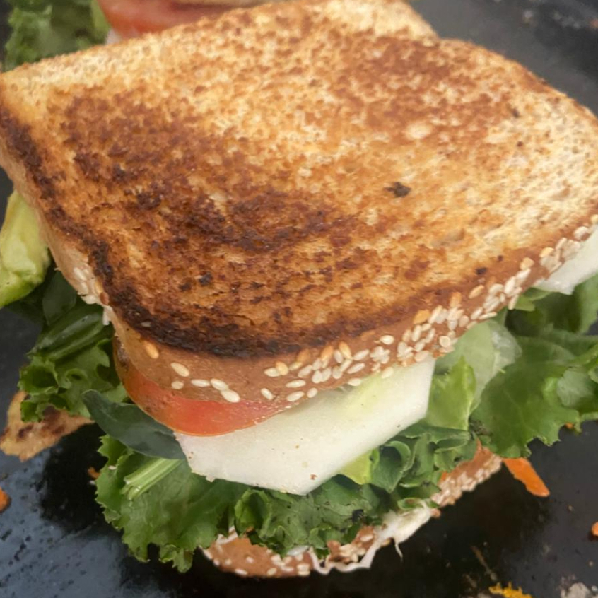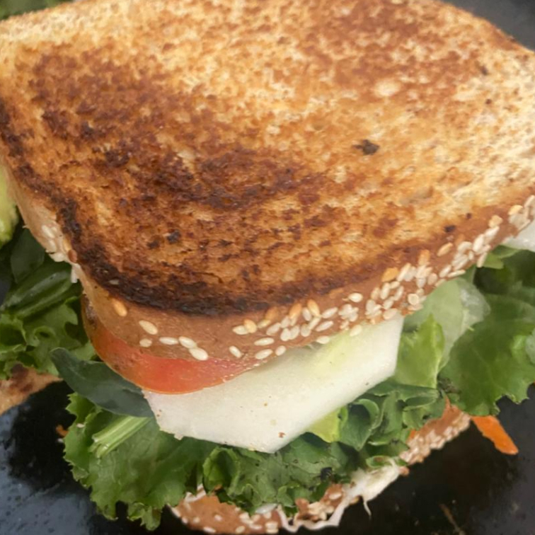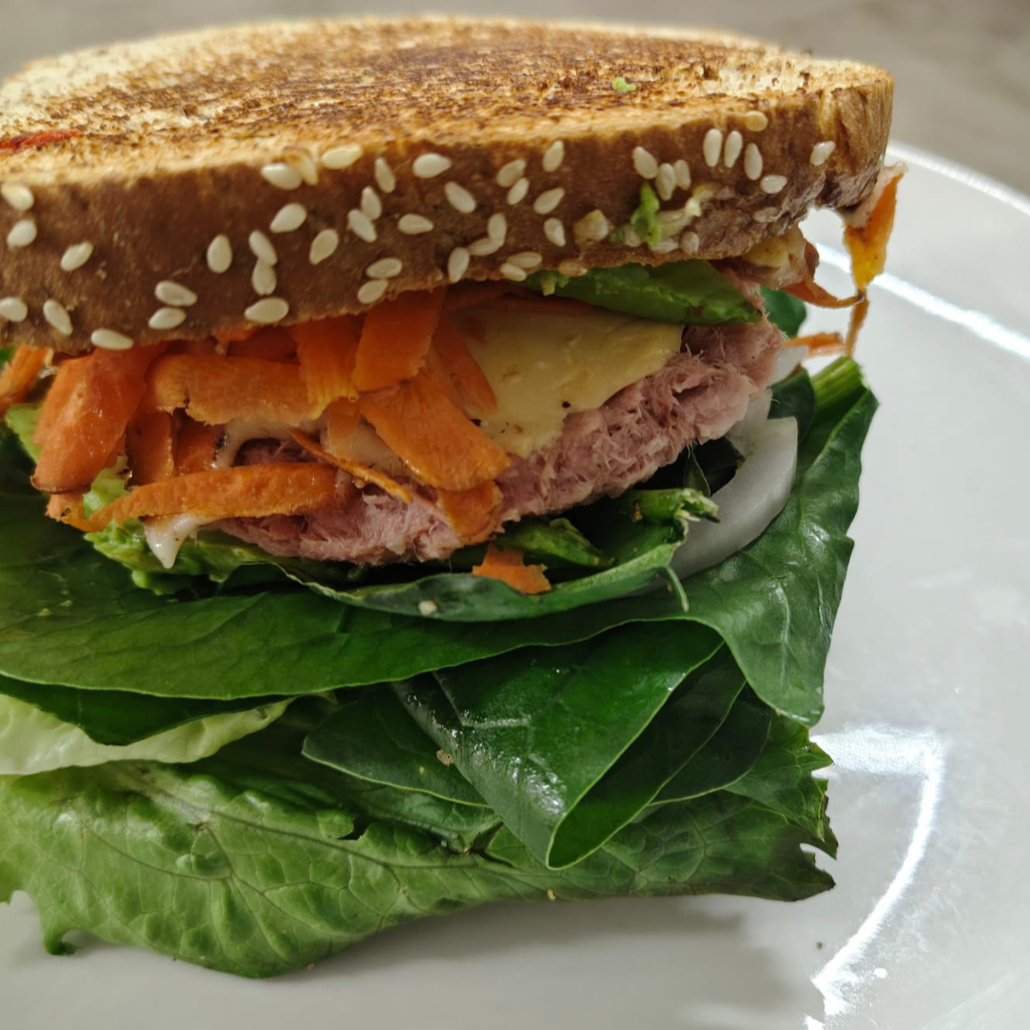 Sándwich con atún, jitomate, aguacate, pepino, zanahoria, quesillo, cebolla, espinaca y lechuga.