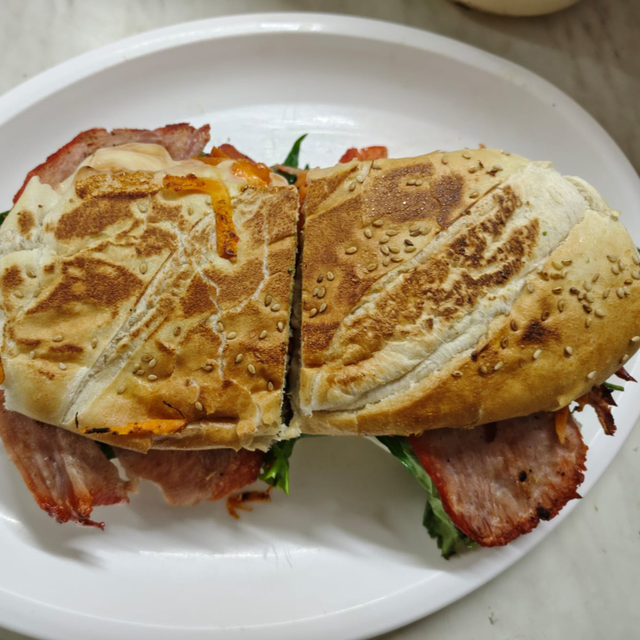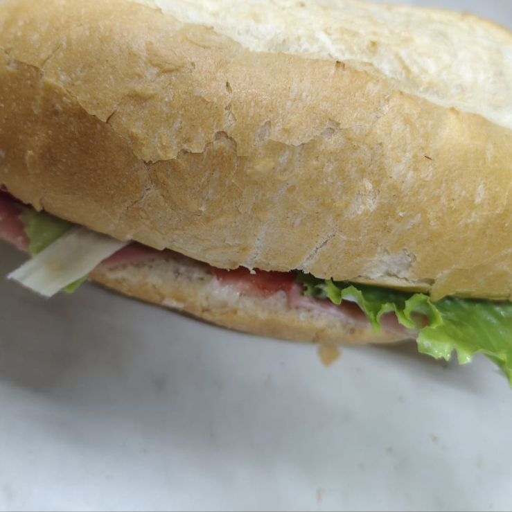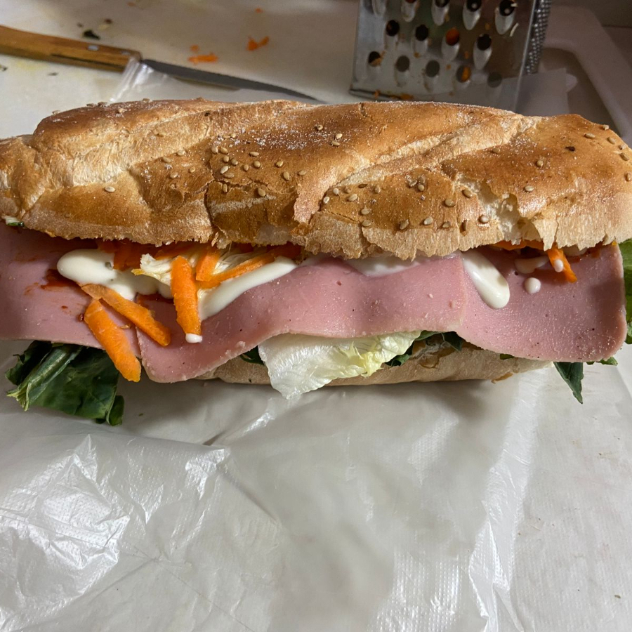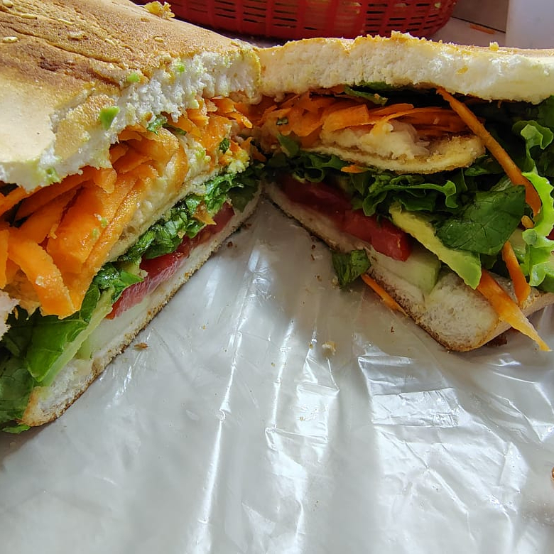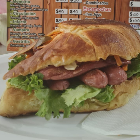 Baguette con jamón, piña, jitomate, aguacate, pepino, zanahoria, quesillo, cebolla, espinaca y lechuga.