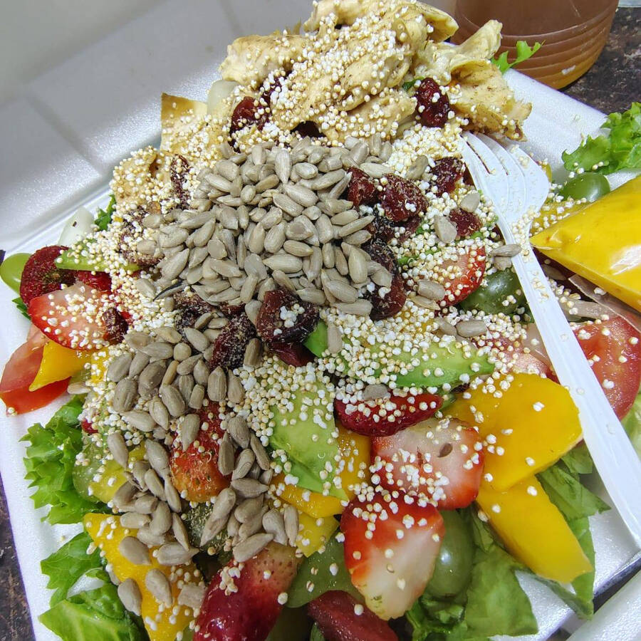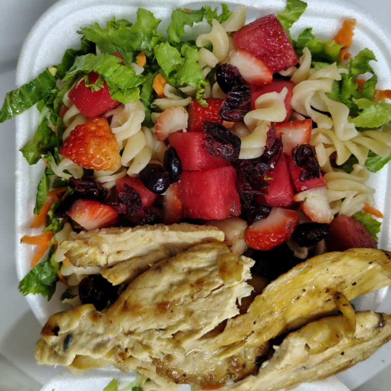 Mix de lechuga y zanahoria acompañada de sandia, arandano, fresa, pasta y pechuga asada
