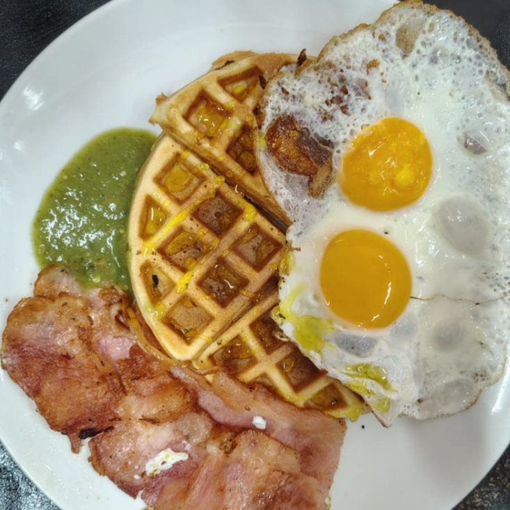 Desayuno Poderoso: Huevo estrellado con tocino crujiente y waffles doraditos. ¡La combinación perfecta para empezar el día con sabor y energía! 🥓🍳🧇