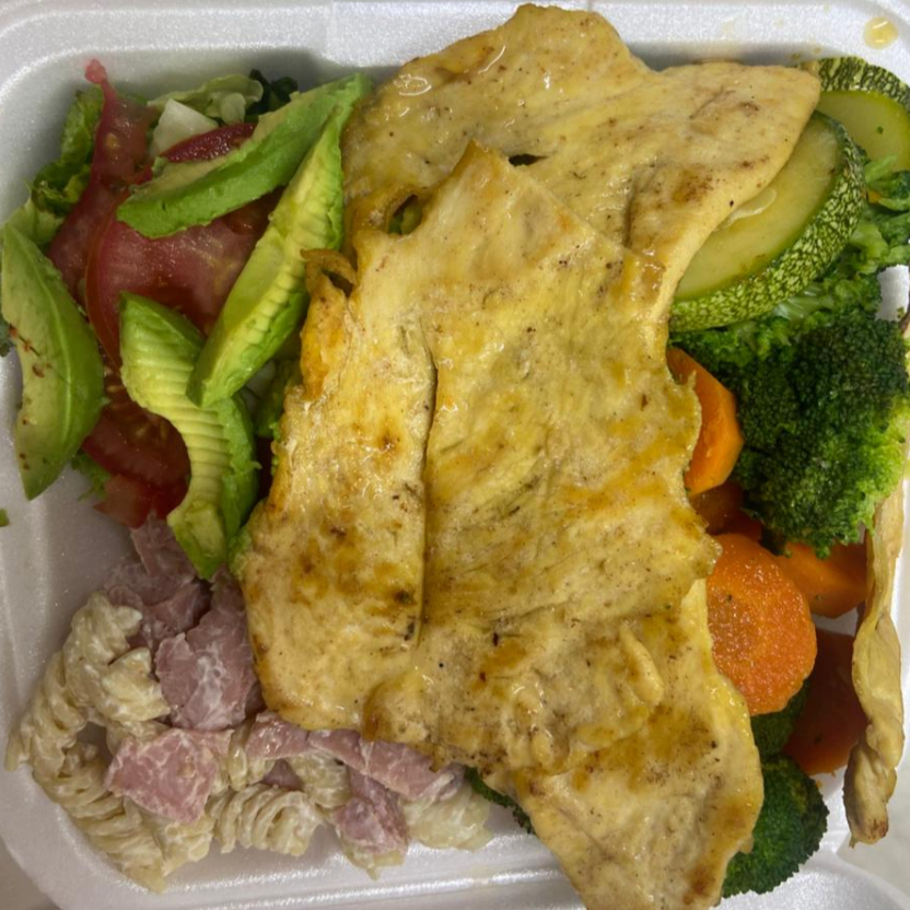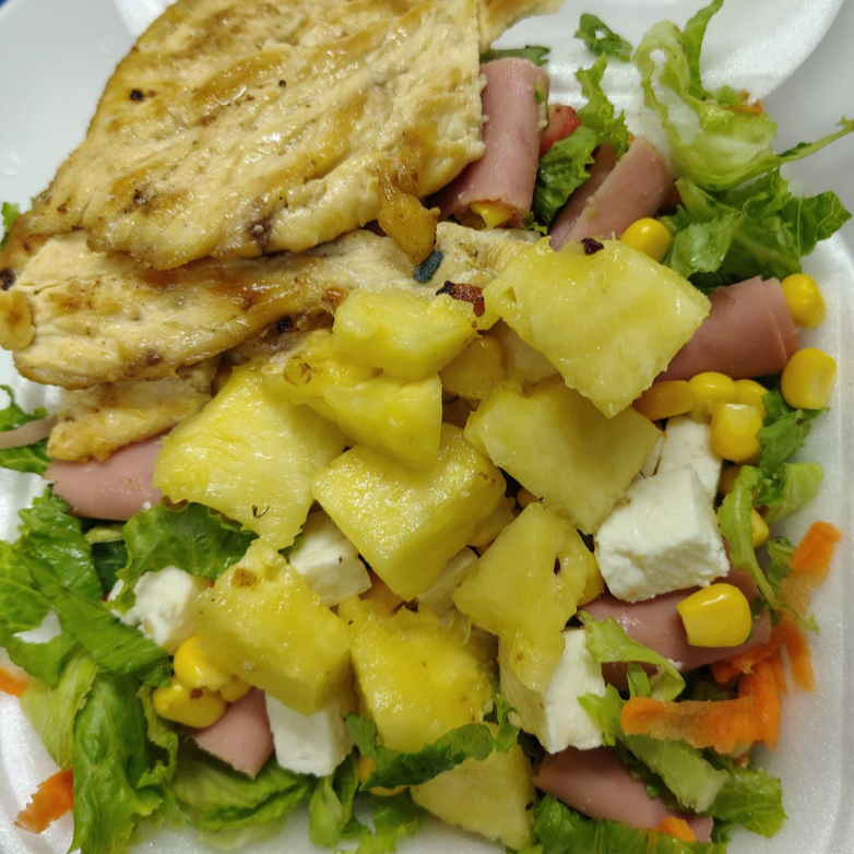 Mix de lechuga y zanahoria acompañada de rollitos de jamon, cubos de queso panela, granitos de elote y sabrosa piña con una pechuga asada