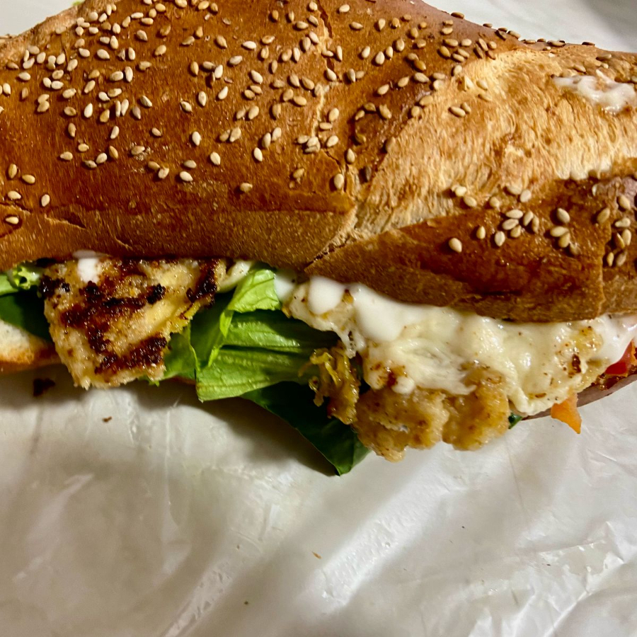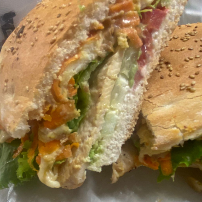 Baguette con pollo, jitomate, aguacate, pepino, zanahoria, quesillo, cebolla, espinaca y lechuga.