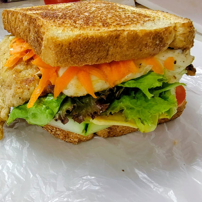 Sándwich con milanesa de pollo, jitomate, aguacate, pepino, zanahoria, quesillo, cebolla, espinaca y lechuga.