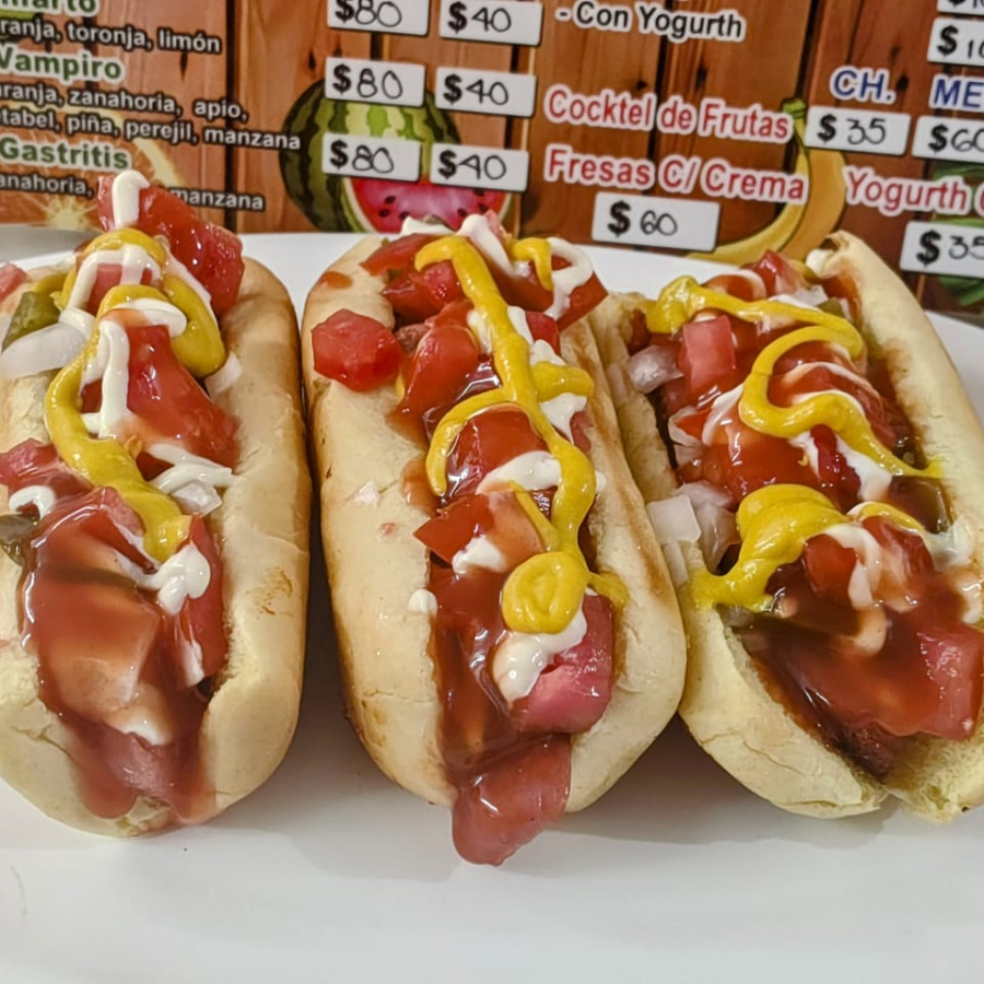 Baguette con salchicha, jitomate, aguacate, pepino, zanahoria, quesillo, cebolla, espinaca y lechuga.
