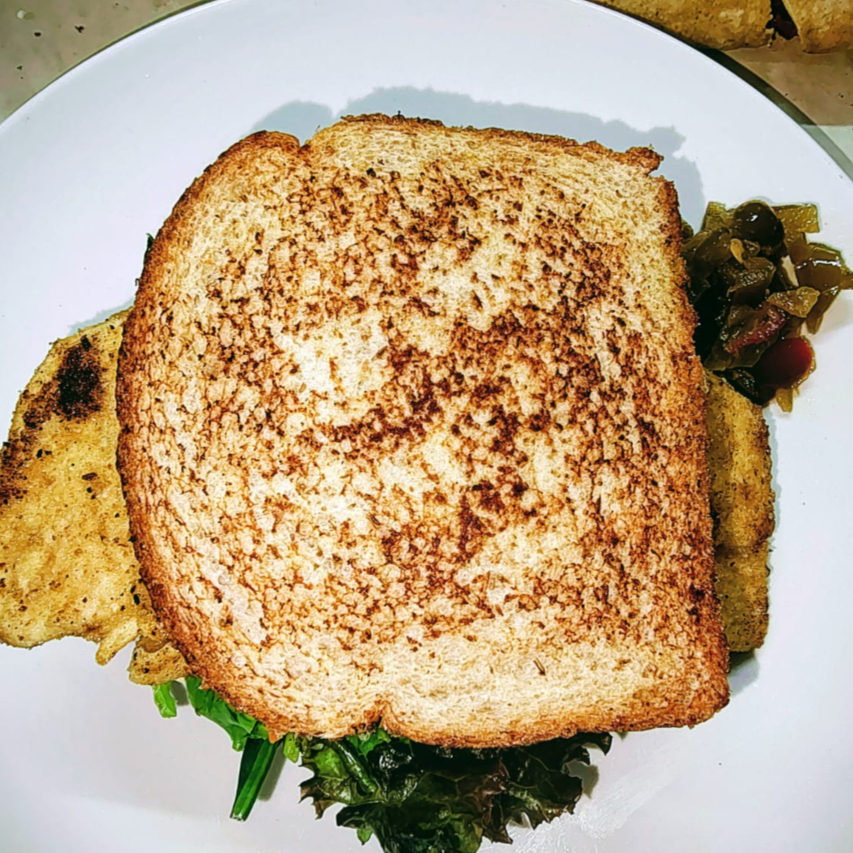 Sándwich con pollo, jitomate, cebolla y lechuga.