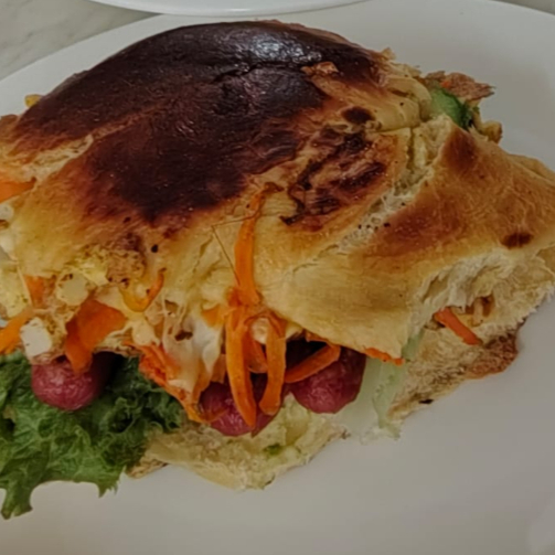 Cuernito con salchicha, jitomate, aguacate, pepino, zanahoria, quesillo, cebolla, espinaca y lechuga.