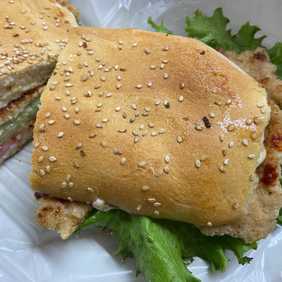 Cuernito con milanesa de pollo, jitomate, aguacate, pepino, zanahoria, quesillo, cebolla, espinaca y lechuga.