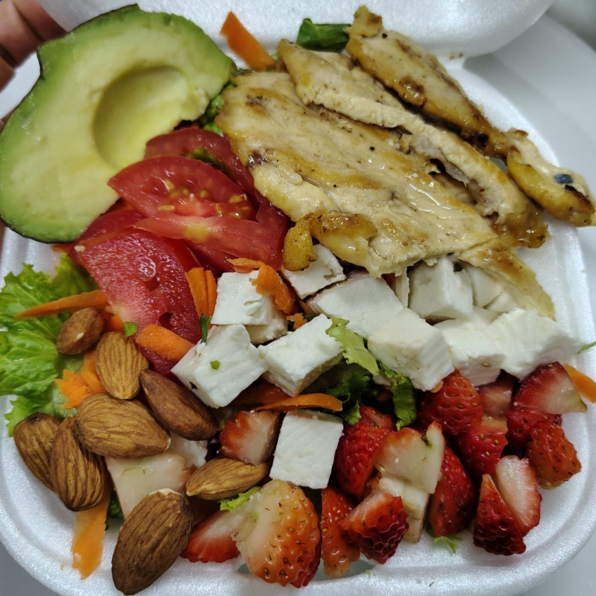 Acompañada de mix lechuga con zanahoria, jitomate, fresa, queso panela , aguacate, almendra y pechuga de pollo asada