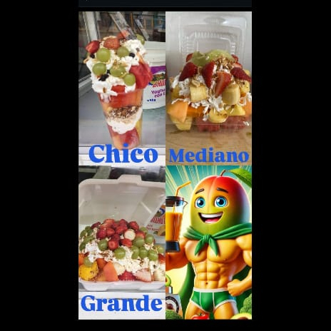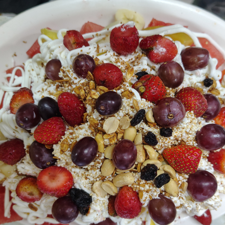 9 Frutas (manzana, sandía, fresa, melón, papaya, uva, piña y plátano), 11 cereales (granola, pasas, cacahuate, amaranto, avena, linaza, chía, arándano, nuez, almendra, semilla de girasol), miel y yogurth del día 500 ml.