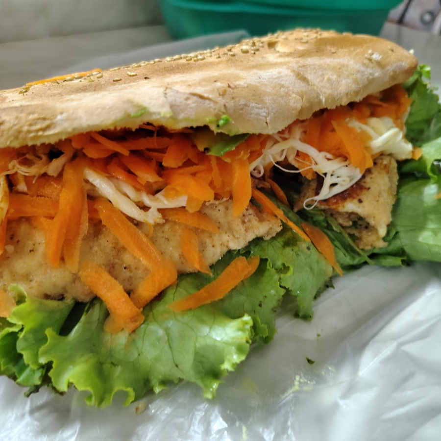 Baguette con milanesa de pollo, jitomate, aguacate, pepino, zanahoria, quesillo, cebolla, espinaca y lechuga.