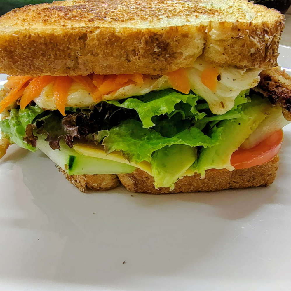 Baguette con huevo, jitomate, aguacate, pepino, zanahoria, quesillo, cebolla, espinaca y lechuga.