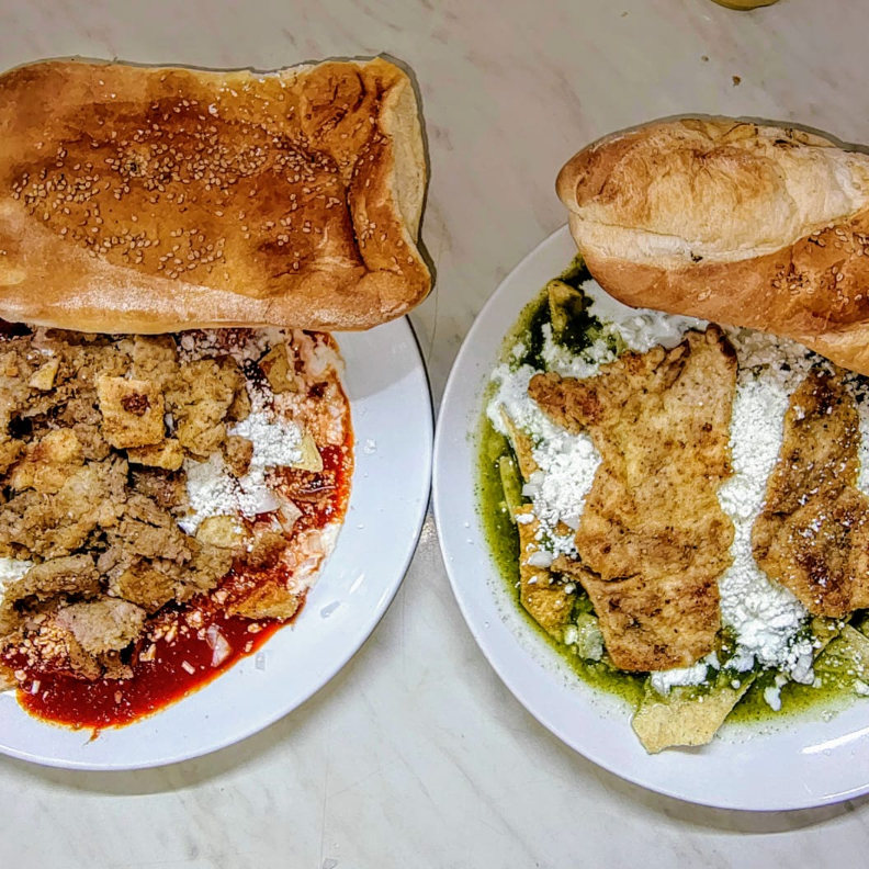 Baguette con milanesa de res, jitomate, aguacate, pepino, zanahoria, quesillo, cebolla, espinaca y lechuga.