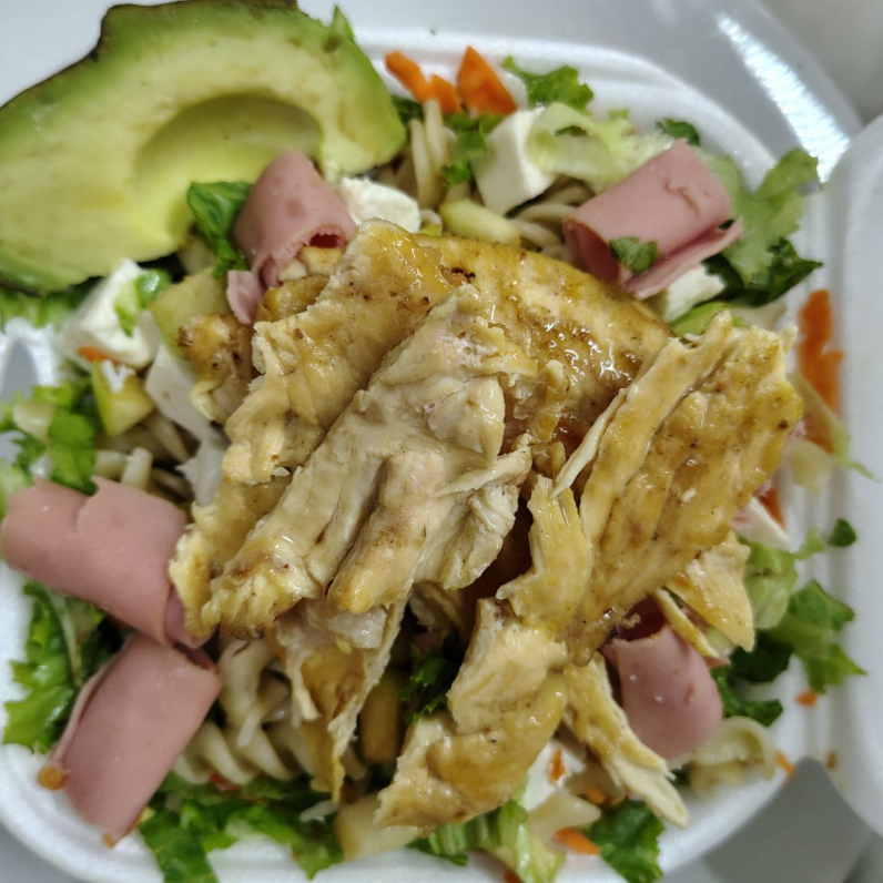 Mix de lechuga con jicama o zanahorial rollitos de jamon, cubitos de queso panela, manzana aguacate y una pechuga asada