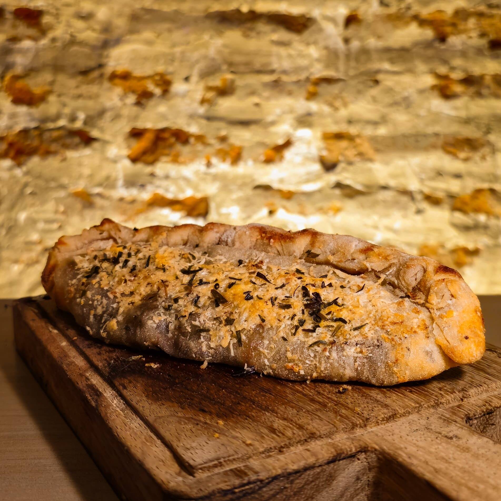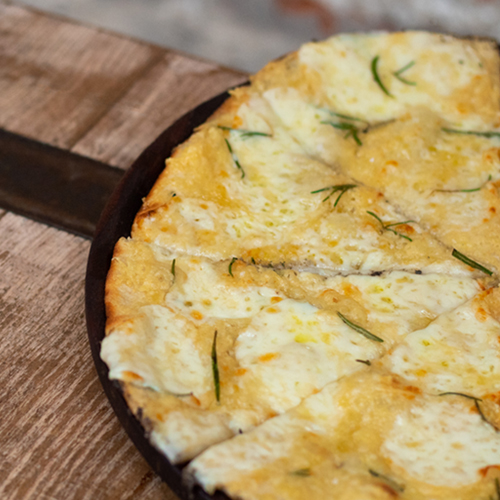 Aceite con ajo, mozarella, parmesano, romero fresco y sal de Colima